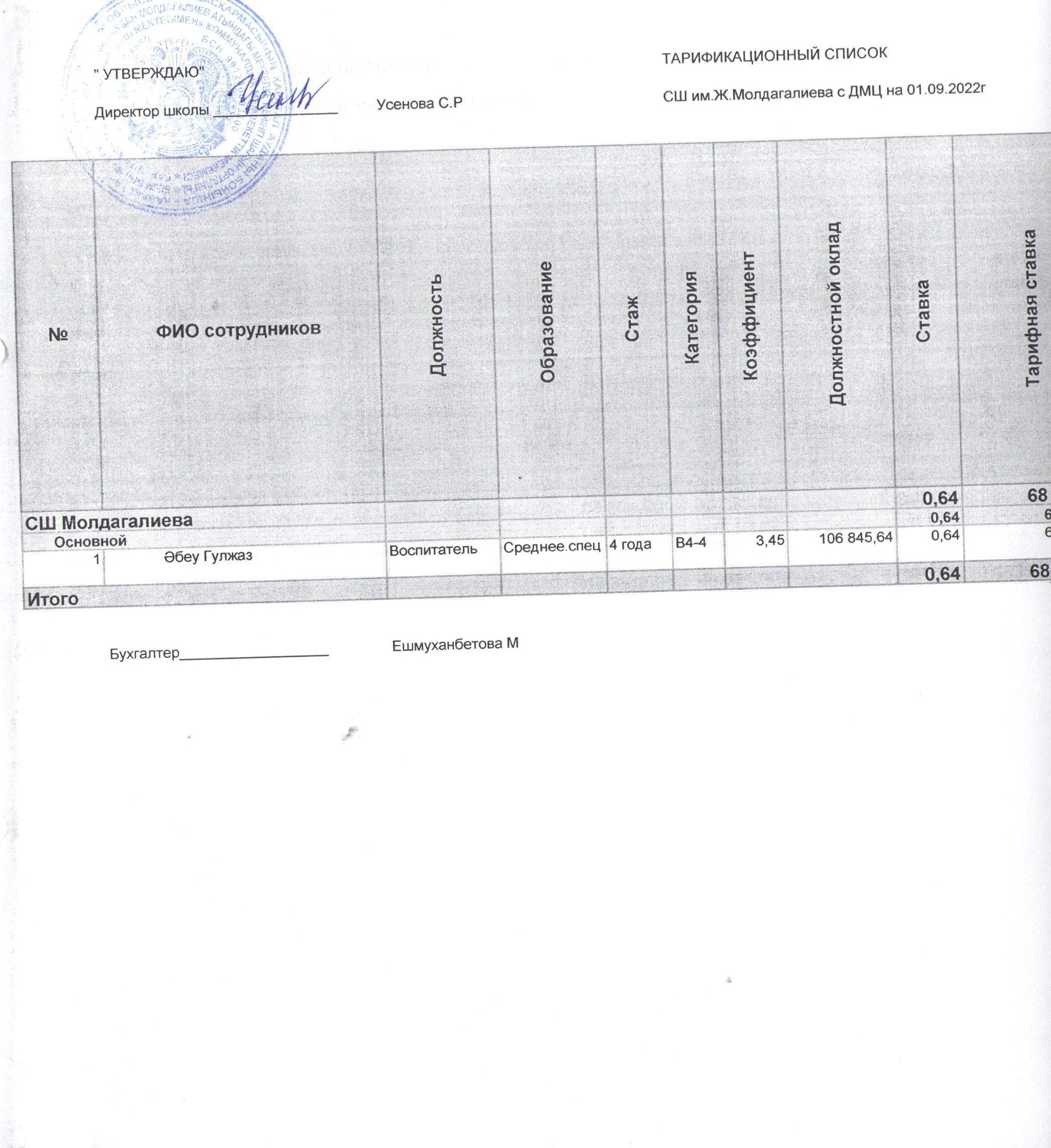 2022-2023 оқу жылы. Шағын орталық тарификациялық тізімі